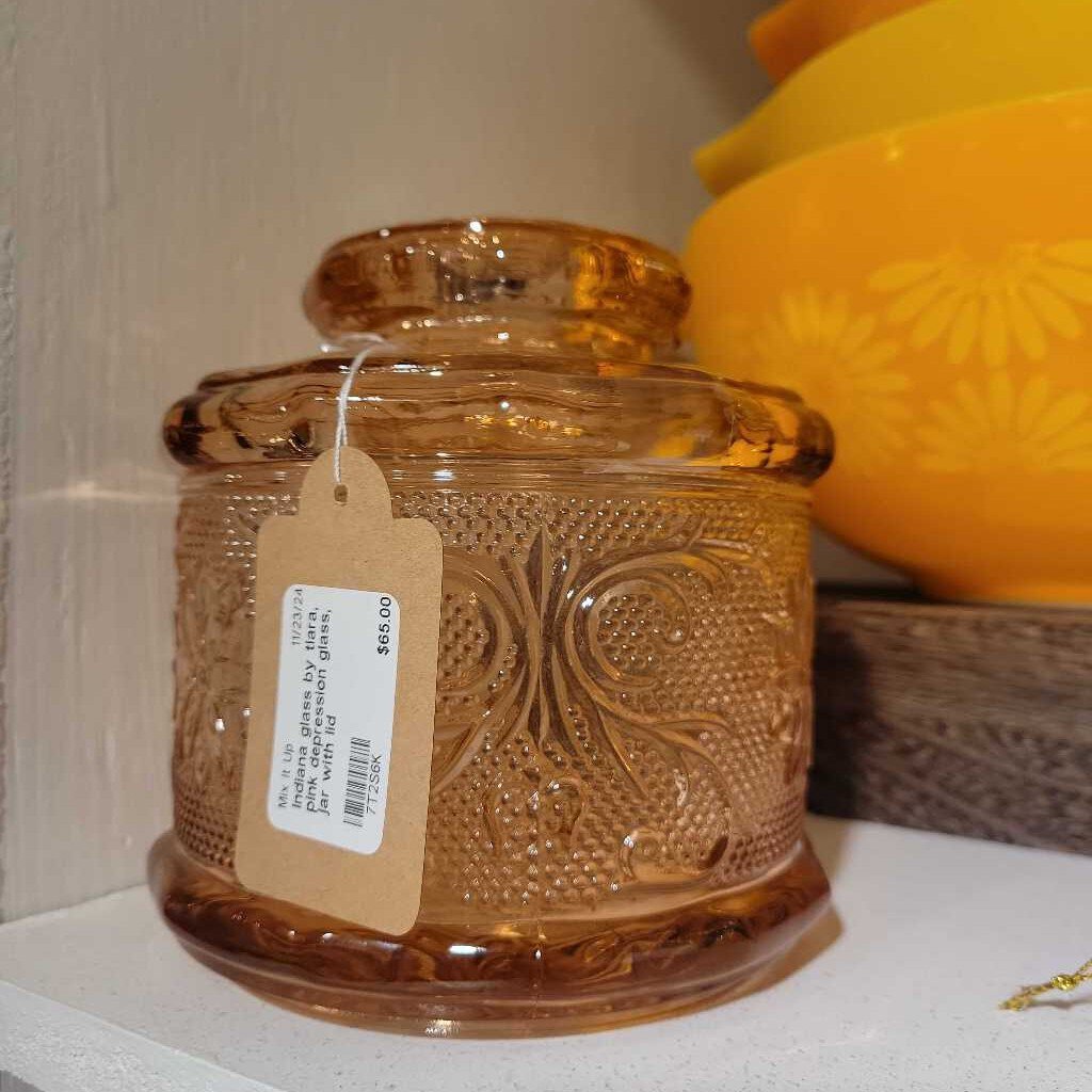 Indiana glass by tiara, pink depression glass, jar with lid